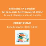 Nel mese di LUGLIO la biblioteca osserva il seguente orario: da LUNEDÌ 30 giugno a VENERDÌ 1° agosto: 8.00 - 14.00. In caso di necessità fuori dall'orario contattare la segreteria.