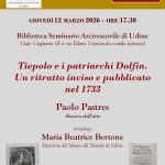 Una collaborazione tra la Biblioteca del Seminario Arcivescovile di Udine e il Museo del Duomo di Udine per capire e approfondire il settecento udinese, un periodo storico, intenso di arte e committenza. Introduce l’incontro la direttrice del Museo del Duomo di Udine, Maria Beatrice Bertone, mentre lo storico dell’arte Paolo Pastres ci parlerà de Le tragedie di Giovanni Delfino, pubblicate a Padova nel 1733, e in particolare del ritratto in antiporta disegnato da Giovanni Battista Tiepolo. Seguirà una breve spiegazione dell’esemplare e di come è composto.I veneziani Dionisio e Daniele Dolfin, ultimi due patriarchi di Aquileia, diedero alla città di Udine non solo grandi apparati decorativi ad opera del Tiepolo- visibili nel palazzo patriarcale, nel duomo della città e nella chiesa della Purità- ma anche opere di minore impegno, come il ritratto dello zio Giovanni, che fu patriarca aquileiese dal 1657 al 1699, inserito ad… leggi >